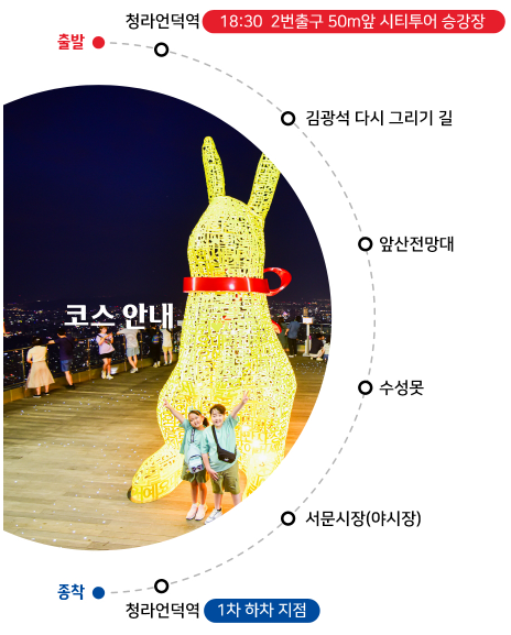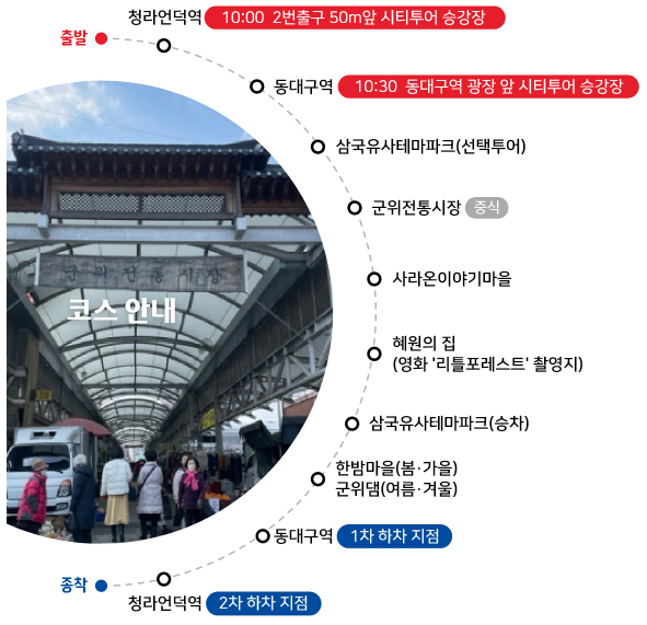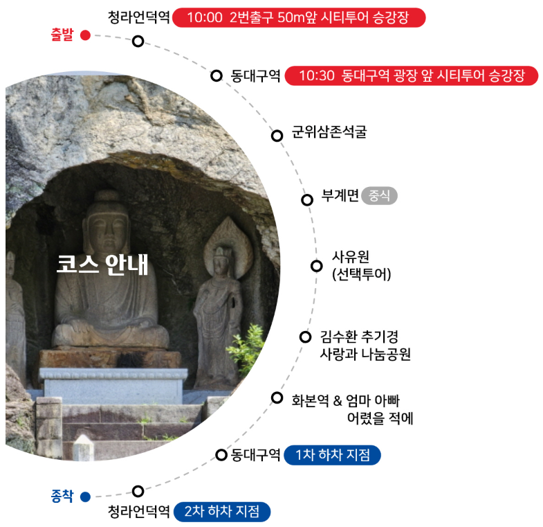 청라언덕역 → 동대구역 → 삼국유사테마파크(선택투어) → 군위전통시장 → 사라온이야기마을 → 혜원의 집(영화 ‘리틀포레스트’ 촬영지) → 삼국유사테마파크(승차) → 한밤마을(봄‧가을)/군위댐(여름‧겨울) → 동대구역 → 청라언덕역![]() |