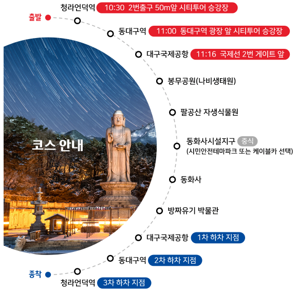 청라언덕역 → 동대구역 → 대구국제공항 → 봉무공원(나비생태원) → 팔공산 자생식물원 → 동화사시설지구(시민안전테마파크 또는 케이블카 선택) → 동화사 → 방짜유기박물관 → 대구국제공항 → 동대구역 → 청라언덕역