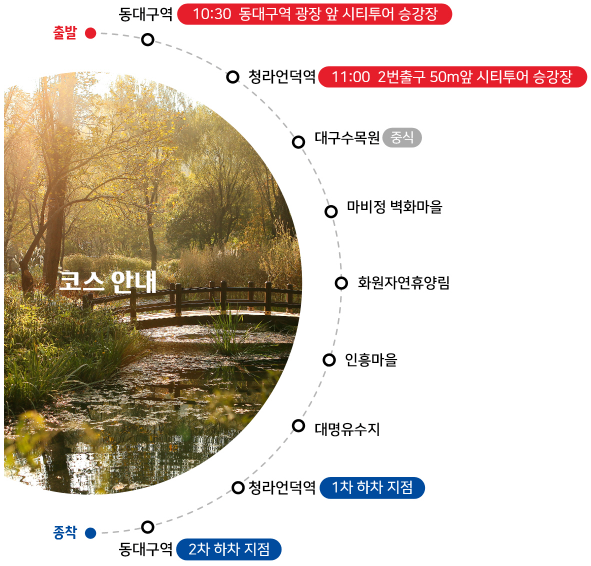 동대구역 → 청라언덕역 → 대구수목원 → 마비정 벽화마을 → 화원자연휴양림 → 인흥마을 → 대명유수지 → 청라언덕역 → 동대구역