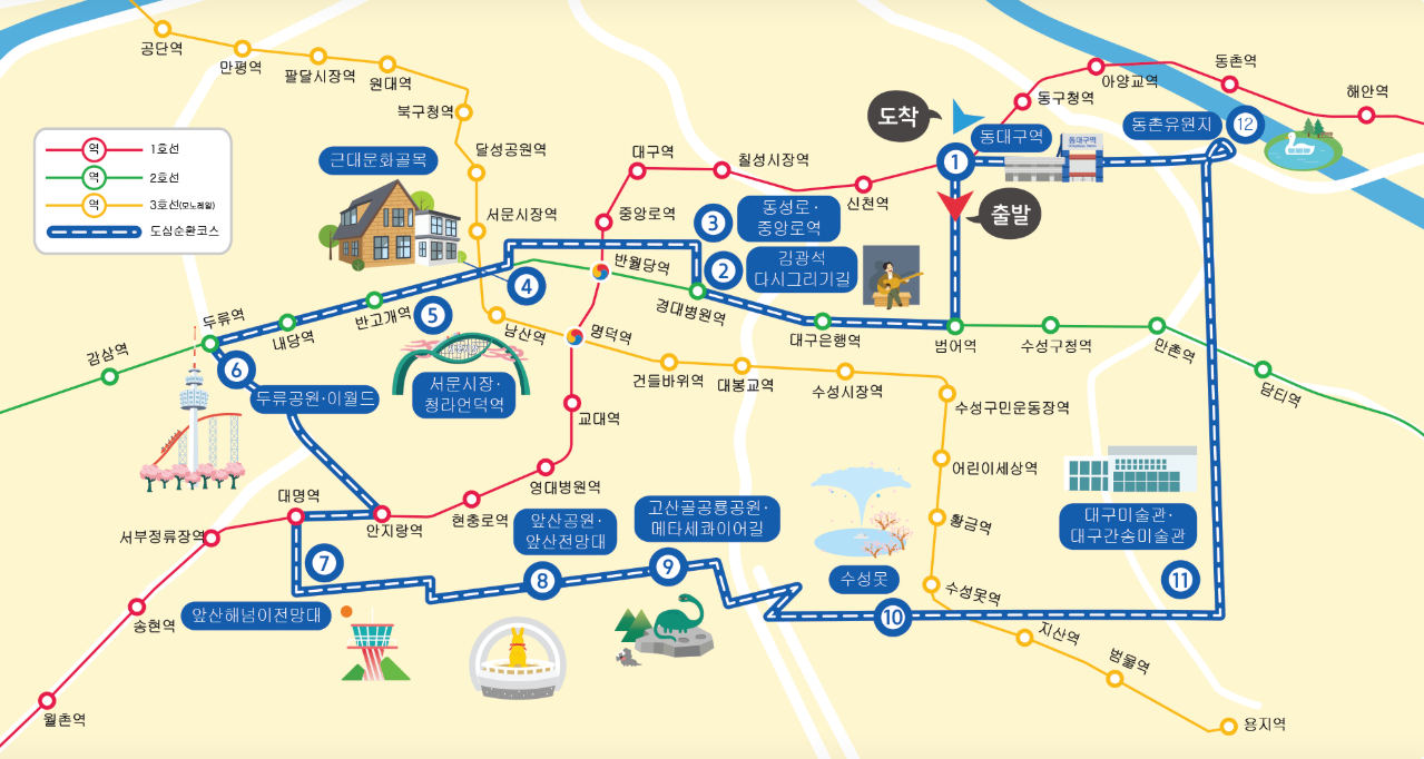 동대구역 → 김광석다시그리기길 → 동성로‧중앙로역 → 근대문화골목 → 서문시장‧청라언덕역 → 두류공원‧이월드 → 앞산해넘이전망대 → 앞산공원‧앞산전망대 → 고산골공룡공원‧메타세콰이어길→ 수성못 → 대구미술관‧대구간송미술관 → 동촌유원지 → 동대구역