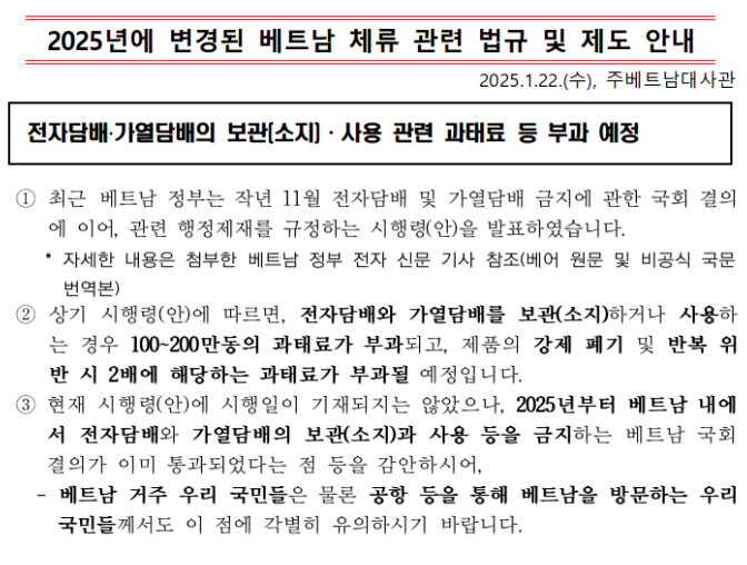 - 전자담배 및 가열 담배 사용 시 100만~200만동 (5만~10만 원) 의 벌금이 부과될 수 있다.