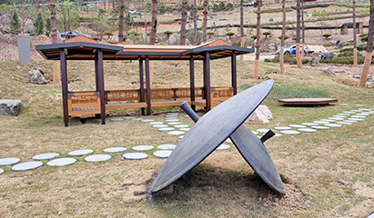 정원 곳곳에 설치된 솥뚜껑 조형물을 찾아보자.