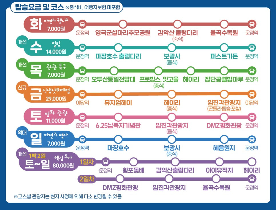 🚍 파주시티투어는 파주의 역사, 문화, 자연을 모두 감상할 수 있도록 요일별로 다르게 운행하며, 요일별 노선을 모두 이용하면 파주일주가 가능하도록 구성돼 있습니다.
