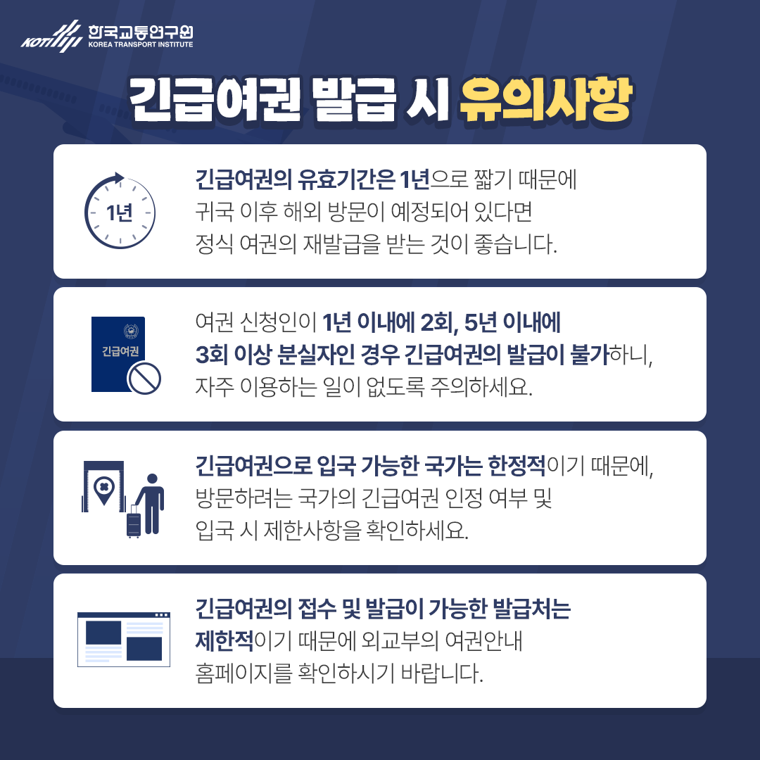 3. 긴급여권으로 입국 가능한 국가는 한정적이기 때문에, 방문하려는 국가의 긴급여권 인정 여부 및 입국 시 제한사항을 확인하세요.