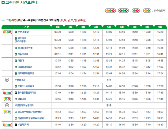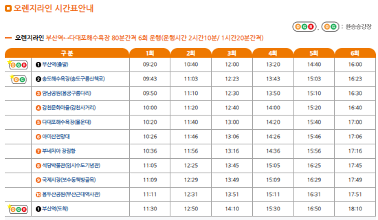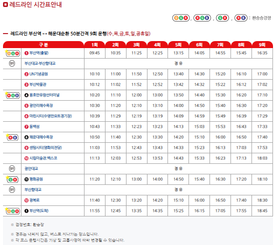 | 구분 | 부산역(출발) | 부산대교 | 부산항대교 | 광안리해수욕장 | 수영2호교 | 마린시티 | 해운대해수욕장 | ||