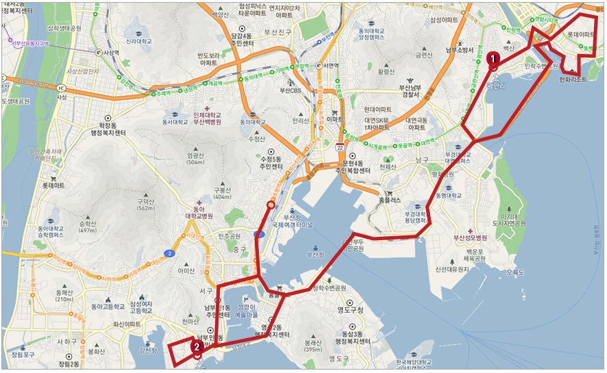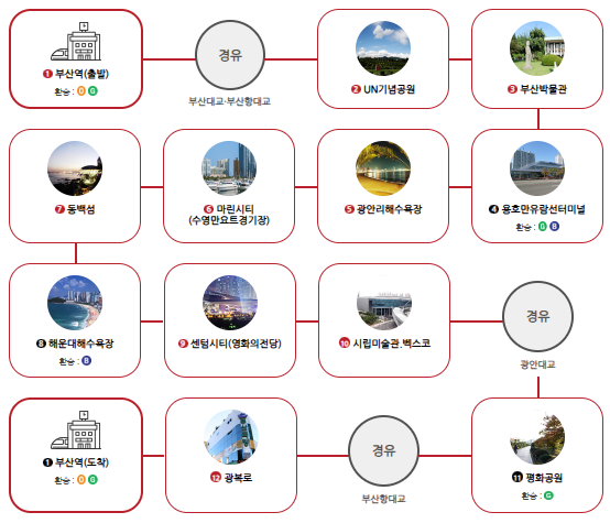 | 구분 | 시립미술관 · 벡스코 | 광안대교 | 부산항대교 | 남항대교 | 송도구름산책로 | 자갈치 · 국제시장 | 부산역(도착) | ||