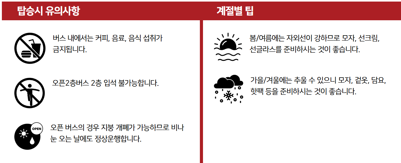 - 코스별 정류장이 많기 때문에, 가고 싶은 명소를 미리 체크하세요.