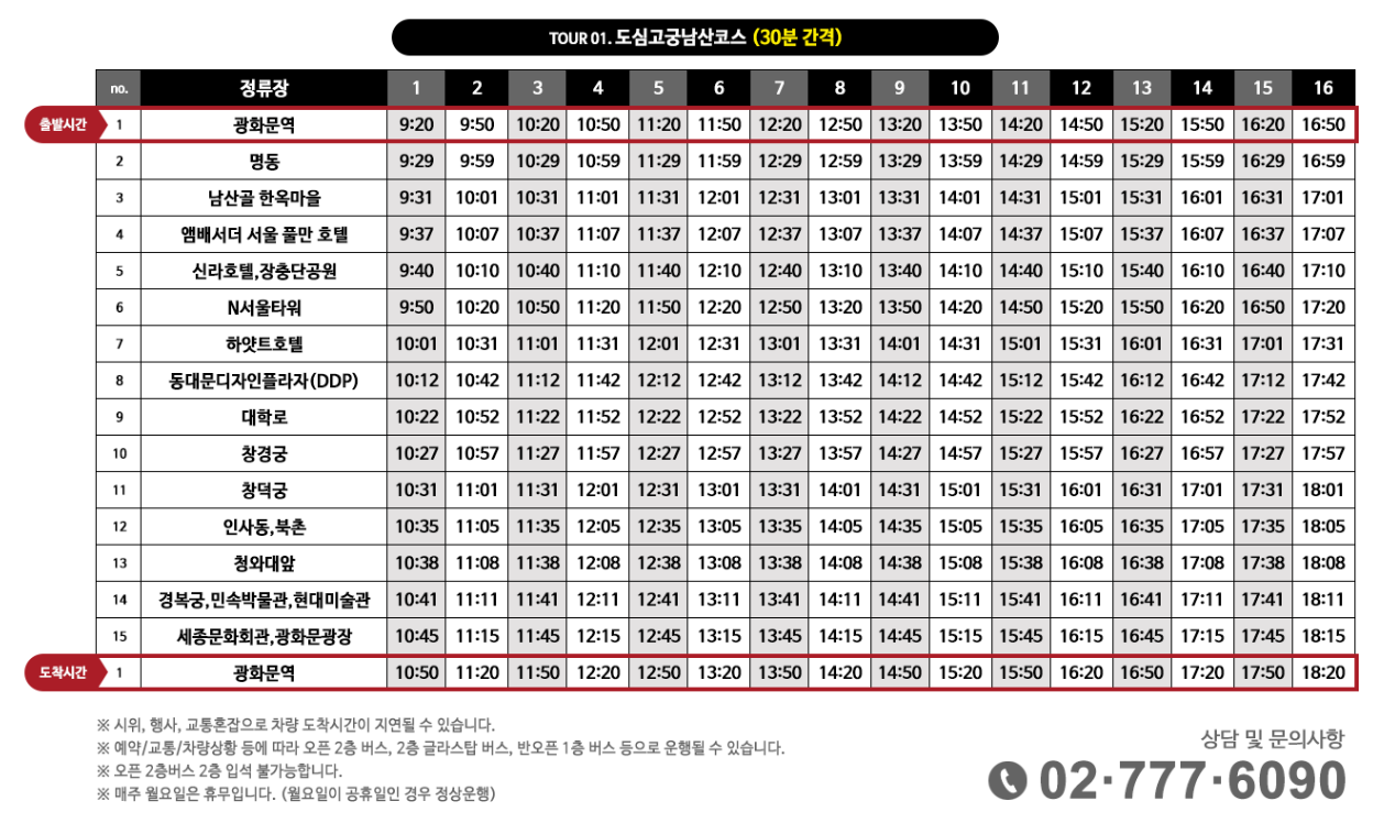 - 도심고궁남산코스는 순환 코스로 예약하신 시간이 아니더라도 자유롭고 편한 시간대에 이용하실 수 있습니다.